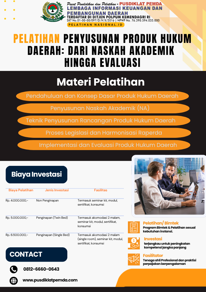 Pusdiklat Pemda didukungan Legitimasi dibawah naungan Kementerian Dalam Negeri dan dibantu tenaga marketing yang professional dan handal, kami siap ikut serta meningkatkan kualitas dan mutu SDM khususnya bidang keuangan dari berbagai kalangan dimana pendidikan yang berkualitas adalah tolak ukurnya.
