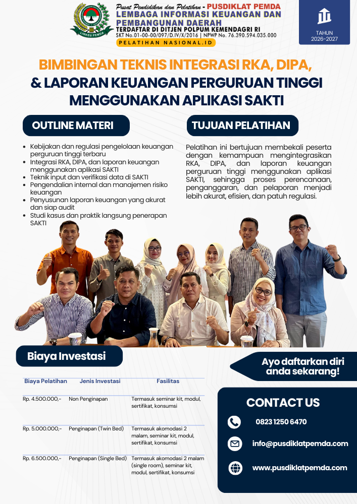Optimalkan pengelolaan keuangan BLU perguruan tinggi Anda, integrasikan RKA, DIPA, dan laporan keuangan menggunakan SAKTI, dan tingkatkan akuntabilitas serta kesiapan audit sekarang.