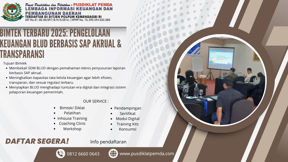Melalui Bimtek BLUD: Pencegahan & Penanganan Penggelapan Keuangan, aparatur BLUD dapat meningkatkan kompetensi, memperkuat sistem pengawasan, dan membangun budaya integritas sehingga keuangan BLUD lebih transparan dan akuntabel.