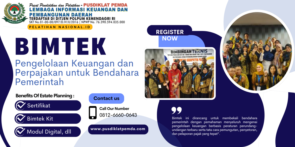 Dalam Rangka Meningkatkan Pemahaman Tentang Kewajiban Perpajakan Bendahara OPD Dan SKPD Dengan Ini Kami Dari Pusat Pendidikan Dan Pelatihan Pusdiklat Pemda Lembaga Informasi Keuangan dan Pembangunan Daerah Sebagai Lembaga Terdaftar Di Dijen POLPUM Kementerian Dalam Negeri Dengan Nomor SKT 01-00-00 / 097/ D.IV/X/2016 Bersama Narasumber Ahli Dari Kementerian Dalam Negeri RI Dan BKN-RI Manyelenggarakan Bimtek Dengan Tema :