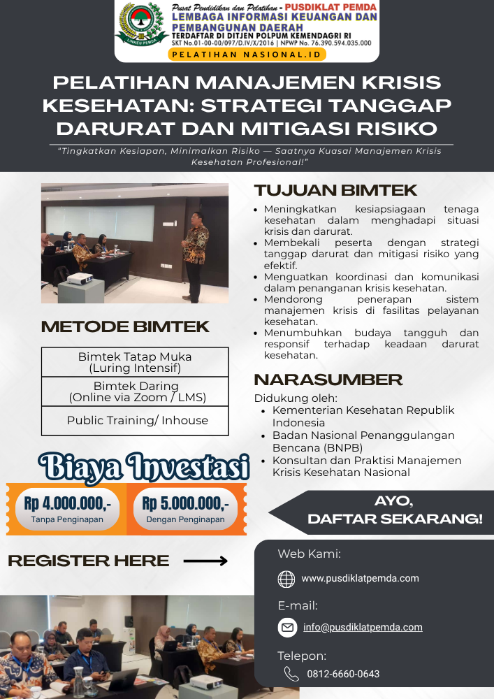 Dalam dunia kesehatan yang dinamis dan kompleks, kemampuan untuk menyampaikan informasi dengan cepat, akurat, dan terkoordinasi sangat penting, terutama saat menghadapi situasi krisis seperti wabah penyakit, bencana alam, atau kegagalan sistem pelayanan. Bimtek Komunikasi Krisis dan Informasi Publik di sektor kesehatan hadir sebagai solusi strategis untuk meningkatkan kapasitas tenaga kesehatan dan pengelola lembaga dalam mengelola komunikasi di masa darurat.