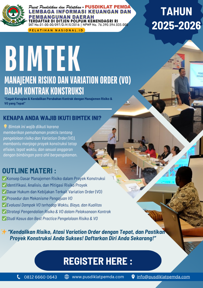 Tingkatkan kompetensi Anda dalam mengelola risiko dan perubahan kontrak secara profesional melalui Bimtek Pengendalian Kontrak Pekerjaan Konstruksi: Pedoman Lengkap untuk Praktisi, agar setiap proyek berjalan efektif, efisien, dan bebas sengketa.