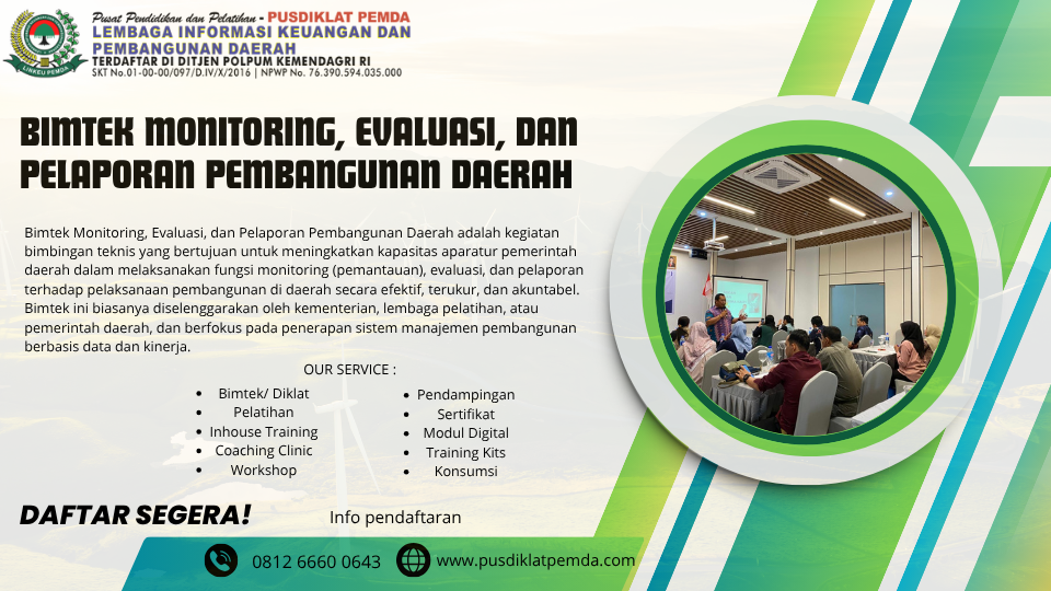 Pelatihan teknis atau bimtek dalam topik Monitoring, Evaluasi, dan Pelaporan Pembangunan Daerah menjadi sangat krusial untuk memperkuat kapasitas aparatur pemerintah daerah (provinsi, kabupaten/kota), guna memastikan bahwa visi-misi pembangunan dapat terealisasi dengan baik. Artikel ini akan menyajikan kerangka komprehensif tentang konsep, metode, tahapan, tantangan, implementasi, serta best practice terkait monitoring, evaluasi, dan pelaporan pembangunan daerah.