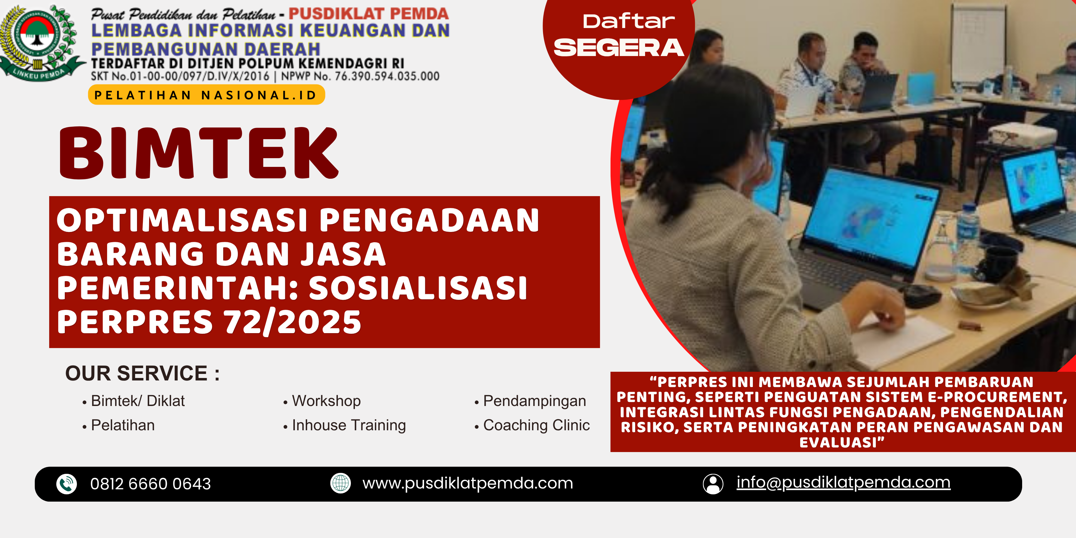 Sehubungan hal tersebut kami dari Pusat Pendidikan Keuangan Dan Pelatihan Pemerintahan Daerah (PUSDIKLAT PEMDA) Selaku penyelenggara kegiatan serta dukungan narasumber yang berkompeten dibidangnya, Mengundang Bapak/Ibu untuk mengikuti kegiatan ”Bimtek Optimalisasi Pengadaan Barang dan Jasa Pemerintah: Sosialisasi Perpres 72/2025″ untuk pendaftaran silahkan menghubungi kami.
