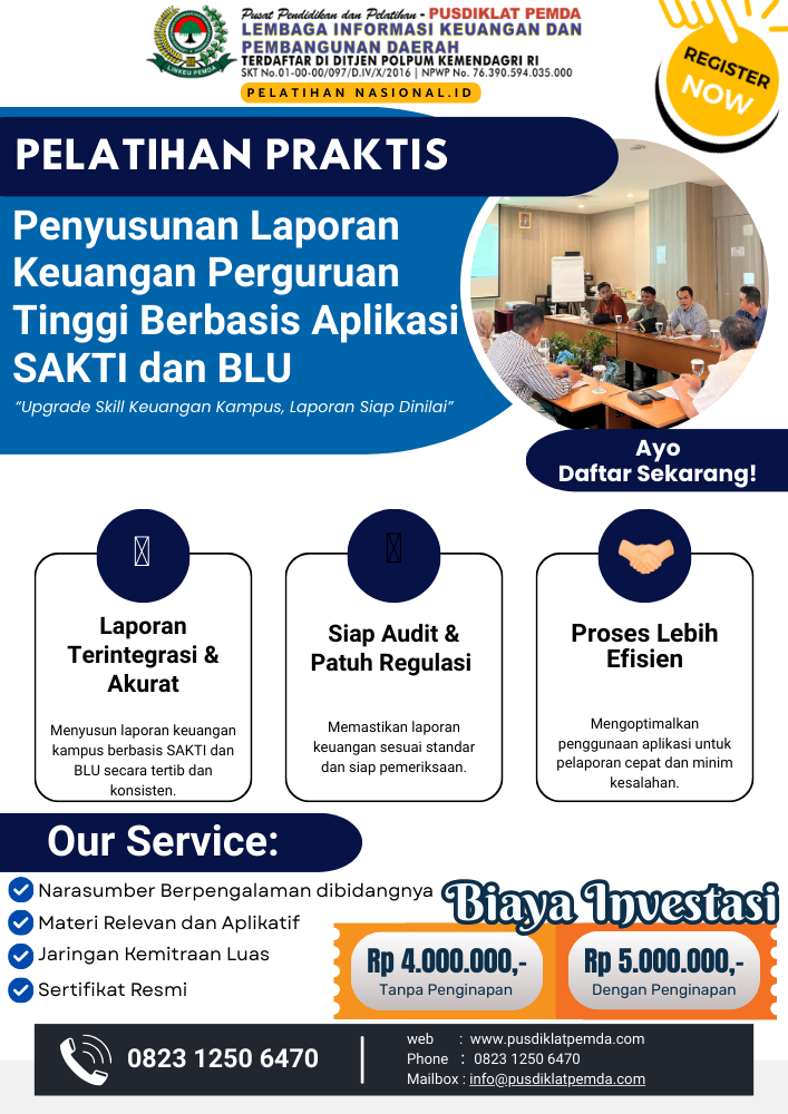 Tingkatkan kompetensi pengelola keuangan BLU, pastikan laporan siap audit, dan optimalkan pengelolaan dana serta aset perguruan tinggi sekarang juga.