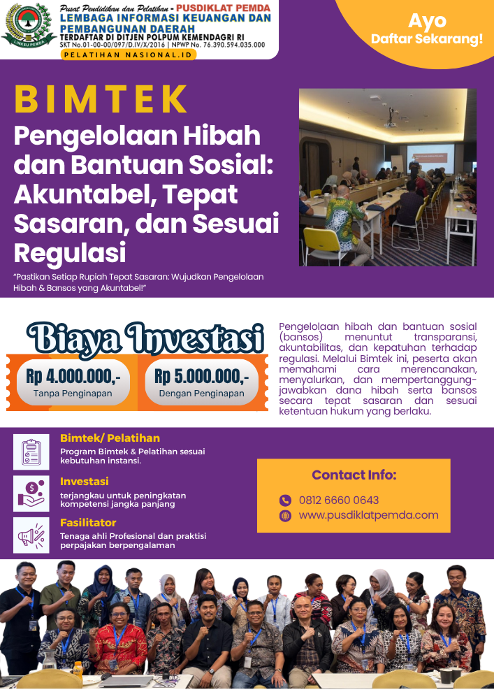Ikuti pelatihan Bimtek Pengelolaan Hibah dan Bantuan Sosial bersama para ahli, tingkatkan profesionalisme, dan wujudkan pengelolaan dana publik yang akuntabel, tepat sasaran, dan sesuai regulasi.