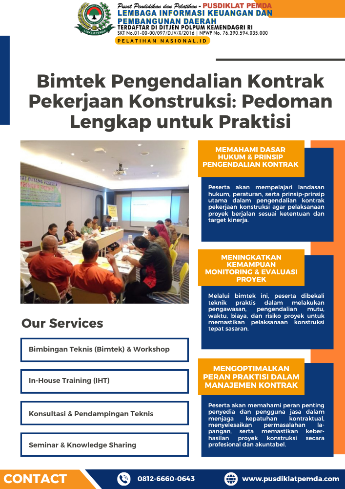 Dalam rangka meningkatkan kualitas pelaksanaan proyek konstruksi, baik dari sisi pemerintah maupun penyedia jasa, Bimtek Pengendalian Kontrak Pekerjaan Konstruksi merupakan program strategis yang memberikan pemahaman, keterampilan dan metodologi praktis untuk: mengelola kontrak dengan baik, memonitor pelaksanaan proyek secara sistematis, mendeteksi deviasi dan mengambil tindakan koreksi, serta menyelesaikan klaim atau sengketa kontrak secara profesional.