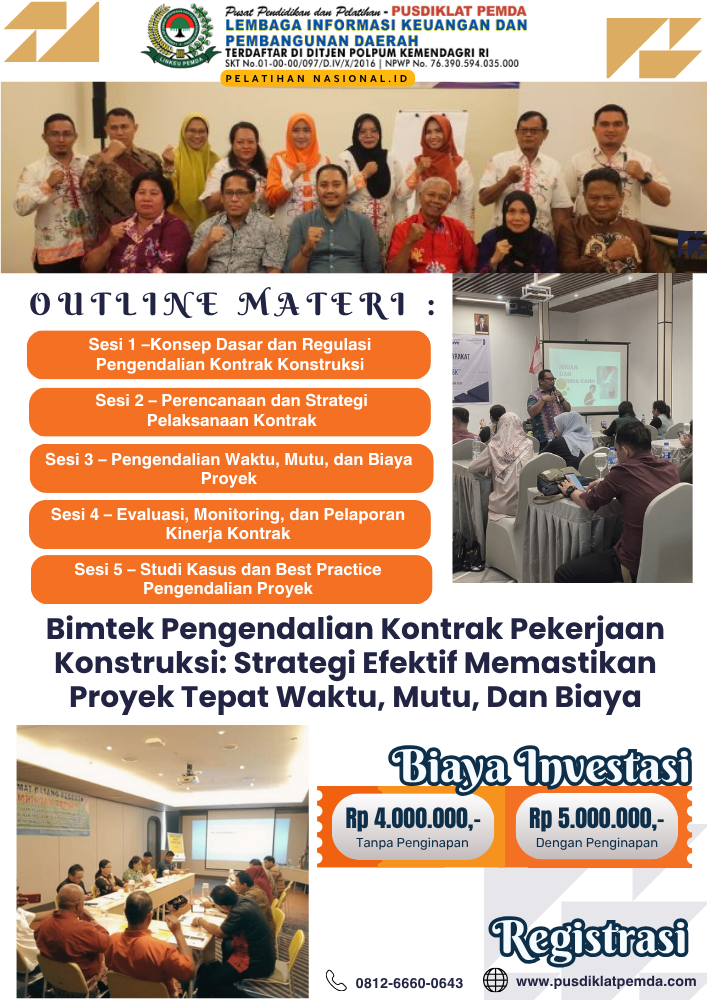 Segera daftarkan diri Anda dalam program Bimtek Pengendalian Kontrak Konstruksi dan pastikan proyek Anda berjalan tepat waktu, tepat mutu, dan tepat biaya.