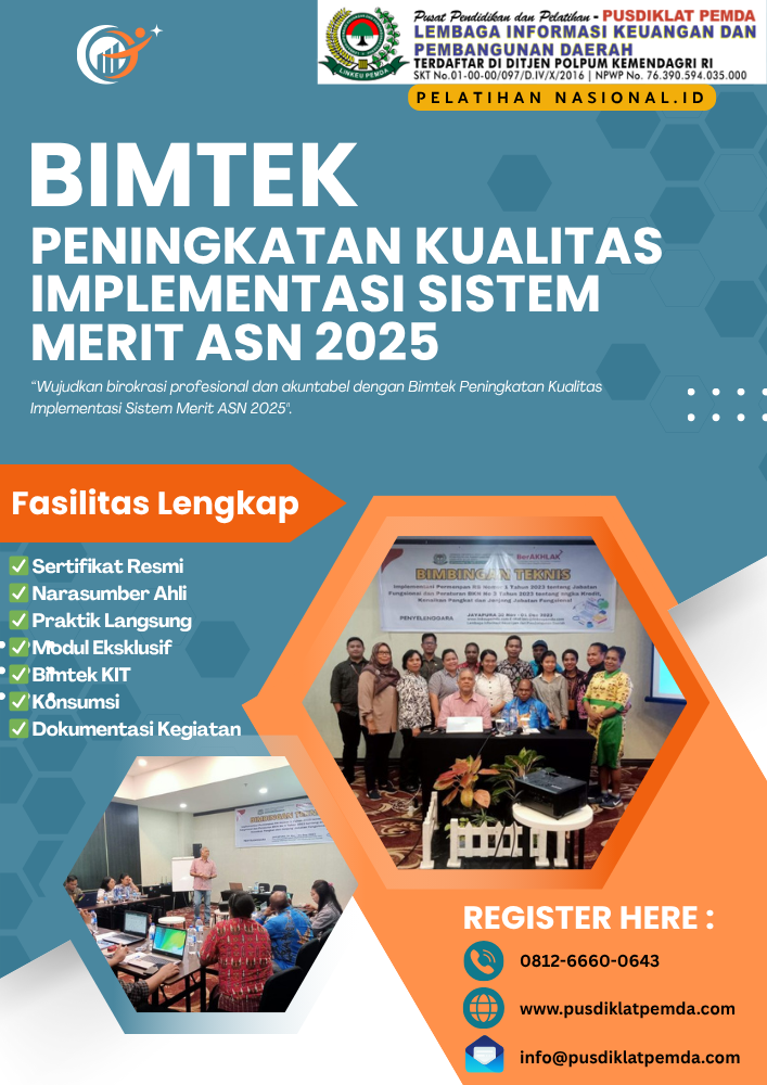 Sehubungan hal tersebut kami dari Pusat Pendidikan Keuangan Dan Pelatihan Pemerintahan Daerah (PUSDIKLAT PEMDA) Selaku penyelenggara kegiatan serta dukungan  narasumber yang berkompeten dibidangnya, Mengundang Bapak/Ibu untuk mengikuti kegiatan ”Bimtek Peningkatan Kualitas Implementasi Sistem Merit ASN 2025″ untuk pendaftaran silahkan menghubungi kami.