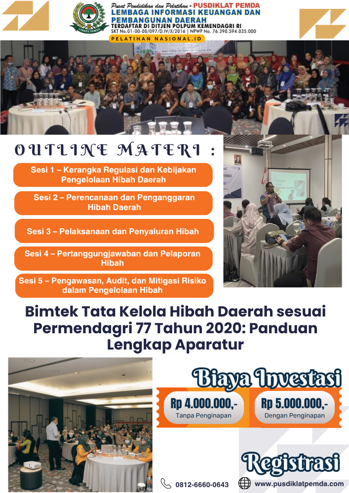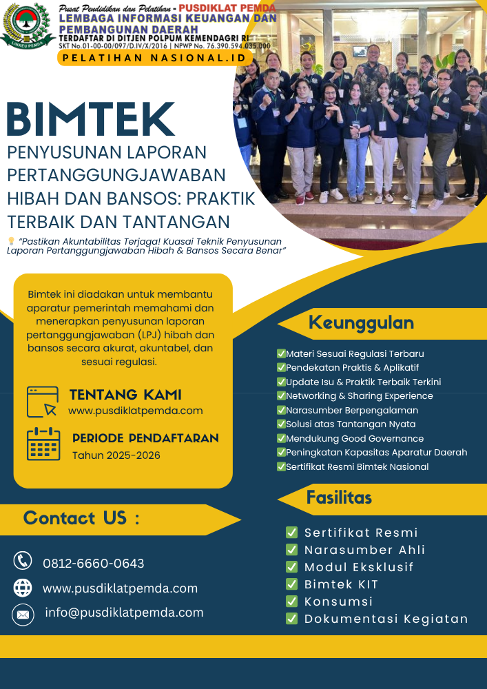 Melalui Bimtek Penyusunan Laporan Pertanggungjawaban Hibah dan Bansos: Praktik Terbaik dan Tantangan, peserta akan memperoleh keahlian teknis yang relevan, pembaruan regulasi terbaru, serta panduan implementasi terbaik di lapangan.
