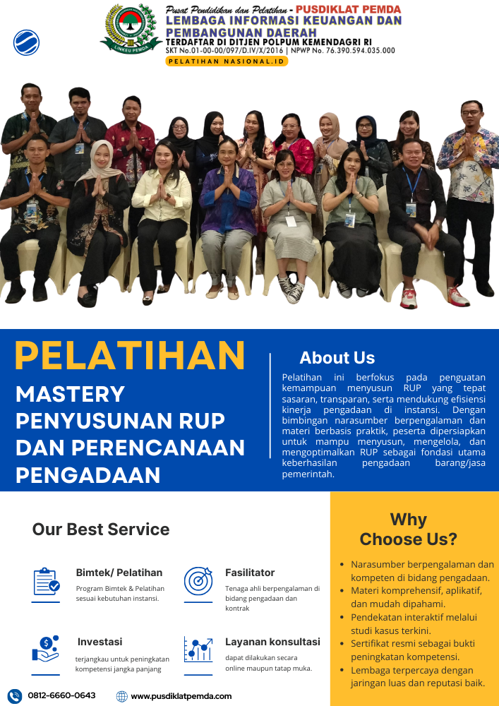 Pusdiklat Pemda didukungan Legitimasi dibawah naungan Kementerian Dalam Negeri dan dibantu tenaga marketing yang professional dan handal, kami siap ikut serta meningkatkan kualitas dan mutu SDM khususnya bidang keuangan dari berbagai kalangan dimana pendidikan yang berkualitas adalah tolak ukurnya.