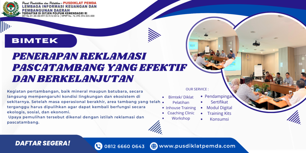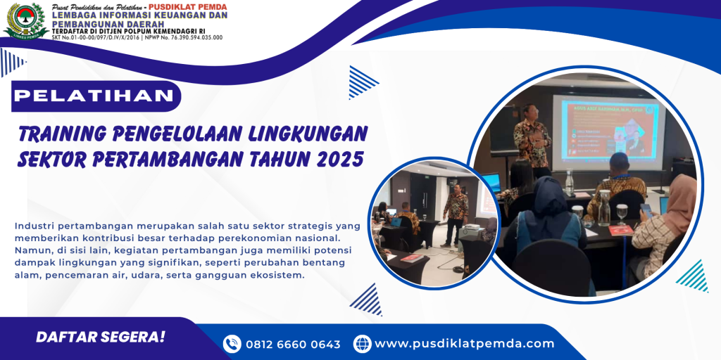 20 Okt Bimtek Lingkungan Hidup Training Pengelolaan Lingkungan Sektor Pertambangan Tahun 2025 Oktober 20, 2025 Oleh PUSDIKLAT PEMDA 0 komentar Facebook Twitter Pinterest linkedin Telegram Sektor pertambangan merupakan salah satu pilar penting bagi pertumbuhan ekonomi Indonesia. Namun, di...Lanjutkan membaca