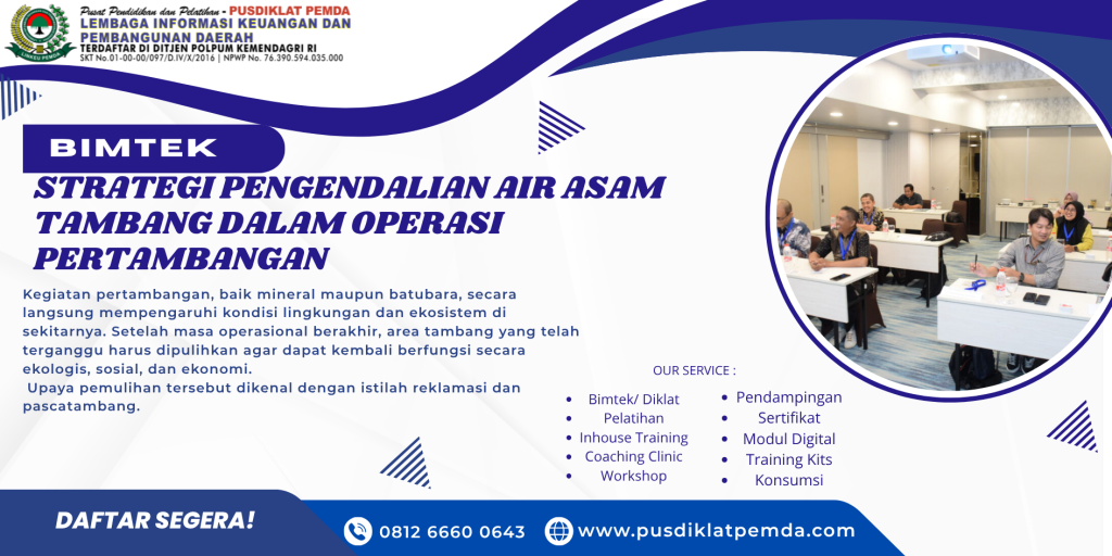 20 Okt Bimtek Lingkungan Hidup Strategi Pengendalian Air Asam Tambang dalam Operasi Pertambangan Oktober 20, 2025 Oleh PUSDIKLAT PEMDA 0 komentar Facebook Twitter Pinterest linkedin Telegram Kegiatan pertambangan selalu berpotensi menimbulkan perubahan besar terhadap lingkungan, baik dari s...Lanjutkan membaca