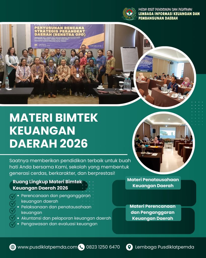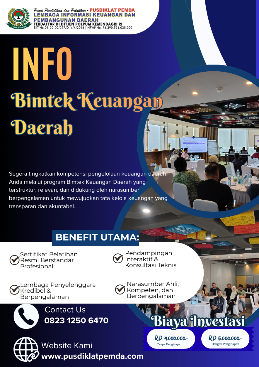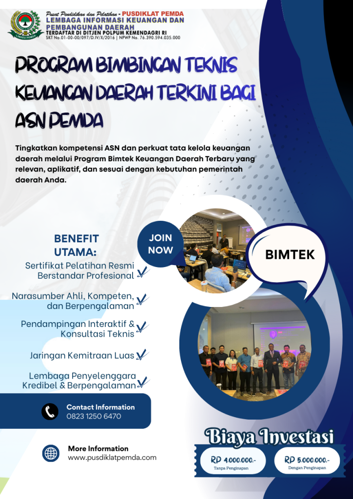 Segera tingkatkan kompetensi pengelolaan keuangan daerah Anda melalui program Bimtek Keuangan Daerah yang terstruktur, relevan, dan didukung oleh narasumber berpengalaman untuk mewujudkan tata kelola keuangan yang transparan dan akuntabel.Info lebih lanjut hubungi nomor kami 082312506470