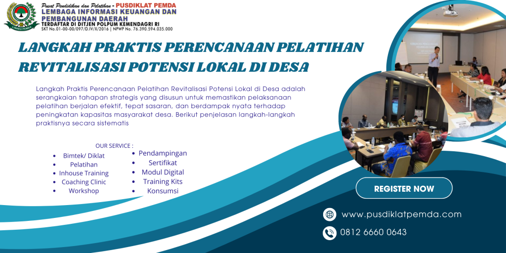 Panduan langkah praktis perencanaan pelatihan revitalisasi potensi lokal di desa agar masyarakat lebih mandiri, berdaya, dan berkelanjutan.