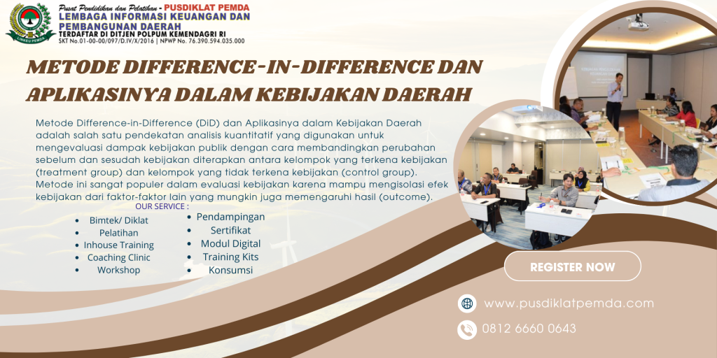 Evaluasi kebijakan publik di tingkat daerah memerlukan pendekatan ilmiah agar hasilnya dapat dijadikan dasar dalam pengambilan keputusan. Salah satu metode yang paling banyak digunakan oleh peneliti kebijakan adalah Difference-in-Difference (DiD). Metode ini membantu pemerintah daerah mengukur dampak dari sebuah kebijakan dengan membandingkan perubahan yang terjadi antara kelompok yang terkena kebijakan (treatment) dan kelompok yang tidak (control).