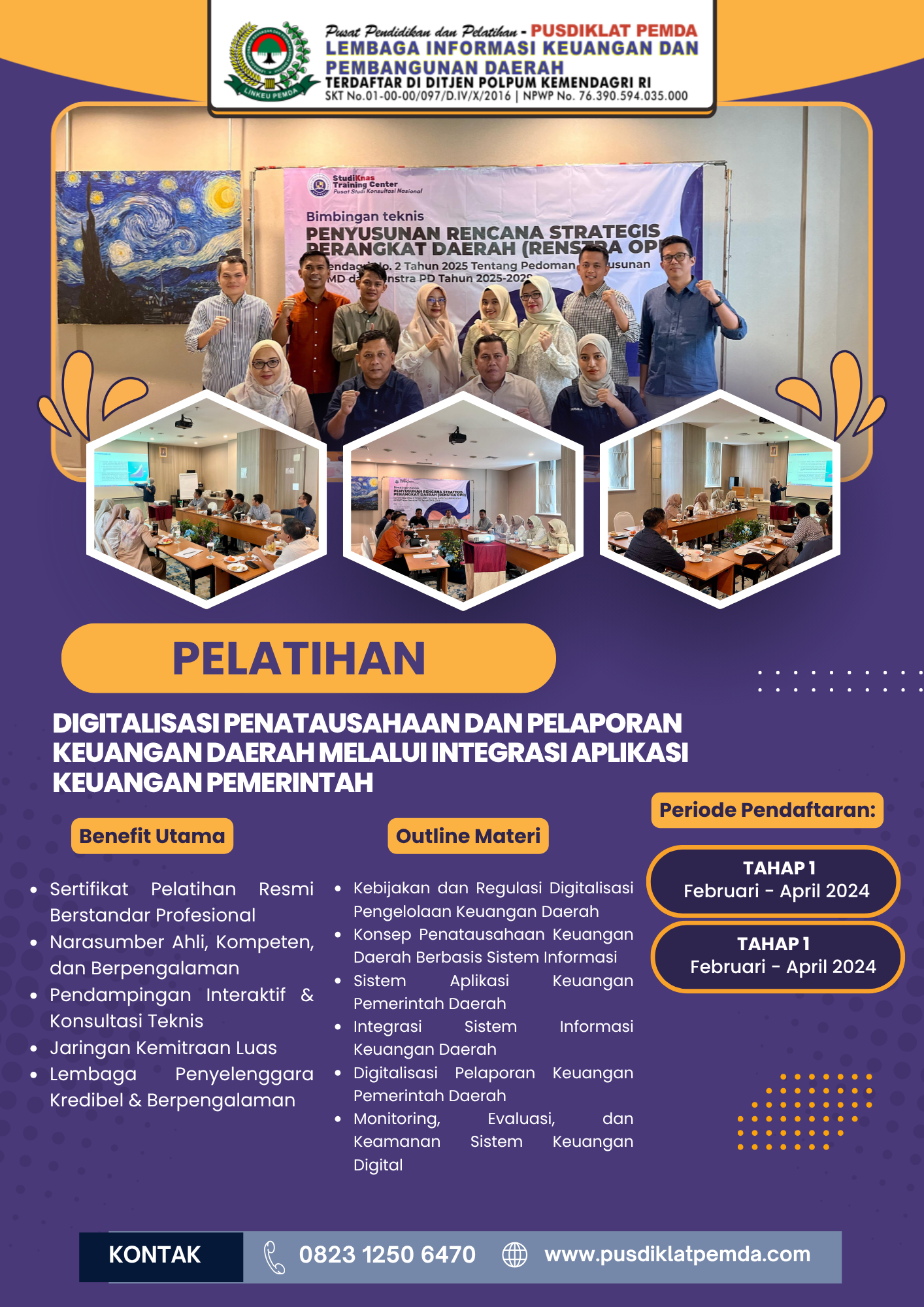 Tingkatkan kapasitas aparatur pemerintah daerah melalui Pelatihan Digitalisasi Penatausahaan dan Pelaporan Keuangan Daerah untuk mewujudkan pengelolaan keuangan yang transparan, akuntabel, dan berbasis teknologi.