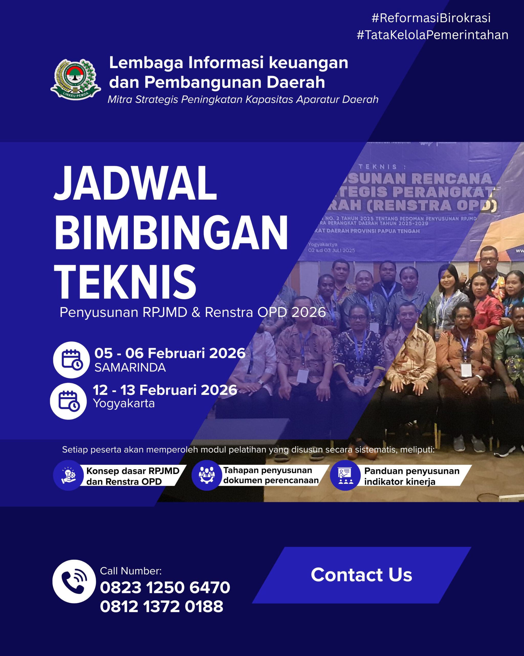 Bimbingan Teknis Penyusunan RPJMD & Renstra OPD 2026 merupakan program peningkatan kapasitas aparatur pemerintah daerah dalam menyusun dokumen perencanaan jangka menengah yang terintegrasi, taat regulasi, dan berbasis kinerja. Kegiatan ini dirancang untuk membantu pemerintah daerah menyelaraskan visi dan misi kepala daerah dengan sasaran pembangunan, indikator kinerja, serta program dan kegiatan OPD. Melalui pendekatan praktis, studi kasus nyata, dan pendampingan teknis, peserta dibekali kemampuan menyusun RPJMD dan Renstra OPD yang sinkron, terukur, dan siap diimplementasikan sesuai ketentuan peraturan perundang-undangan yang berlaku.