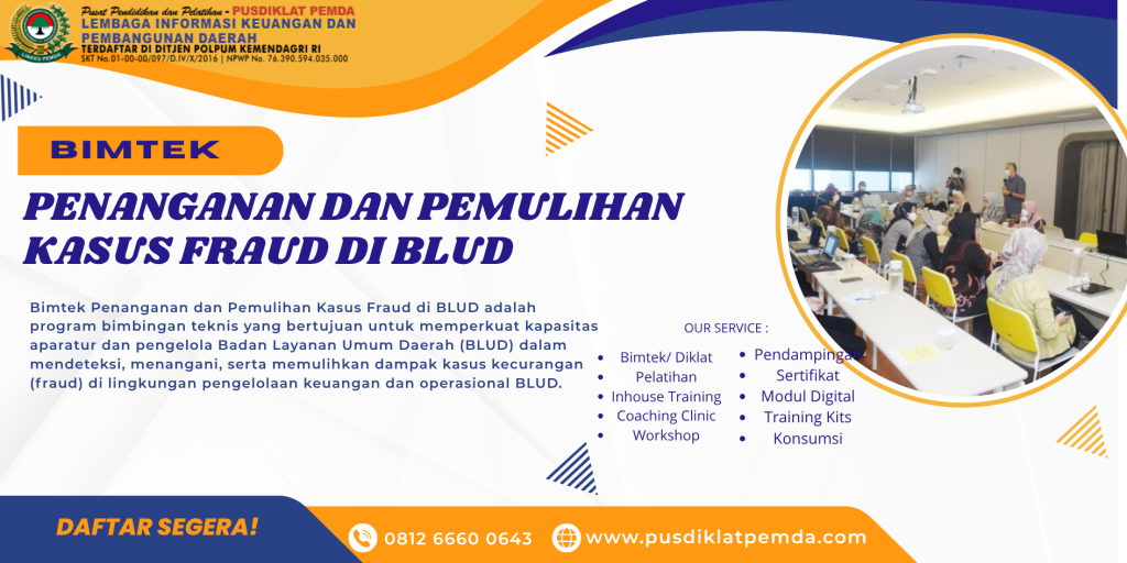 Tegakkan integritas dan akuntabilitas keuangan di lembaga Anda melalui pelatihan profesional Bimtek Governance & Kepatuhan BLUD: Tata Kelola, Audit, dan Pengawasan Internal yang membekali peserta dengan strategi nyata pencegahan dan penanganan fraud secara efektif.