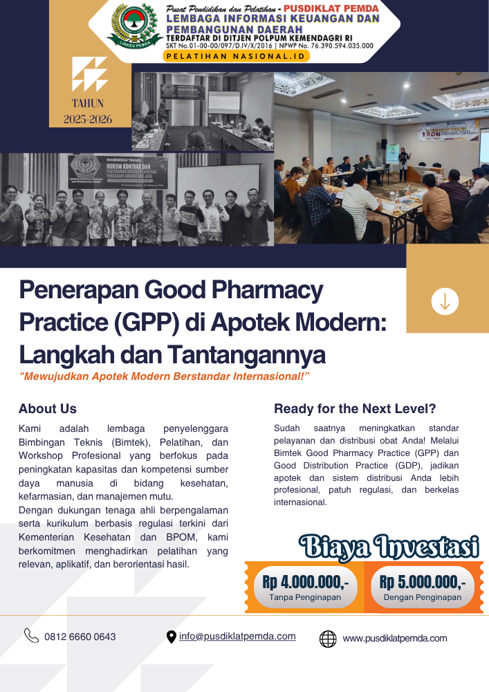 ✨ Tingkatkan standar apotek Anda melalui pelatihan dan penerapan GPP yang efektif. Jadilah bagian dari transformasi pelayanan farmasi yang lebih profesional, aman, dan berdaya saing tinggi!
