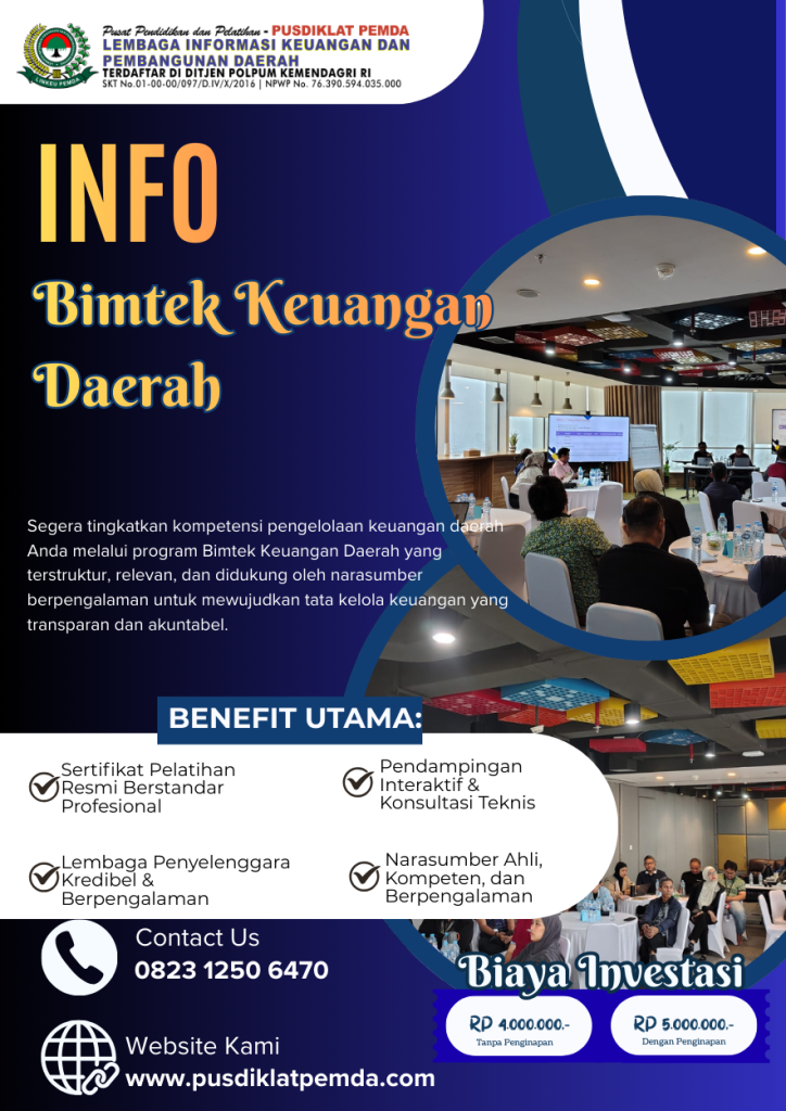 Tingkatkan kompetensi ASN dan perkuat tata kelola keuangan daerah melalui Program Bimtek Keuangan Daerah Terbaru yang relevan, aplikatif, dan sesuai dengan kebutuhan pemerintah daerah Anda.Info lebih lanjut hubungi nomer kami  0823 1250 6470