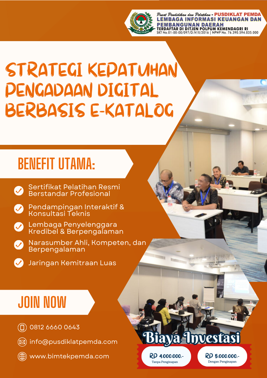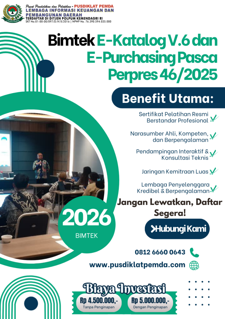 Dengan menerapkan strategi kepatuhan pengadaan digital berbasis E-Katalog secara konsisten, instansi pemerintah dapat memastikan bahwa e-Purchasing berjalan sesuai regulasi, transparan, dan akuntabel. Tingkatkan pemahaman dan kompetensi SDM pengadaan Anda melalui Bimtek E-Katalog V.6 dan E-Purchasing Pasca Perpres 46/2025 agar pengadaan digital tidak hanya efisien, tetapi juga patuh dan berorientasi pada tata kelola yang baik.