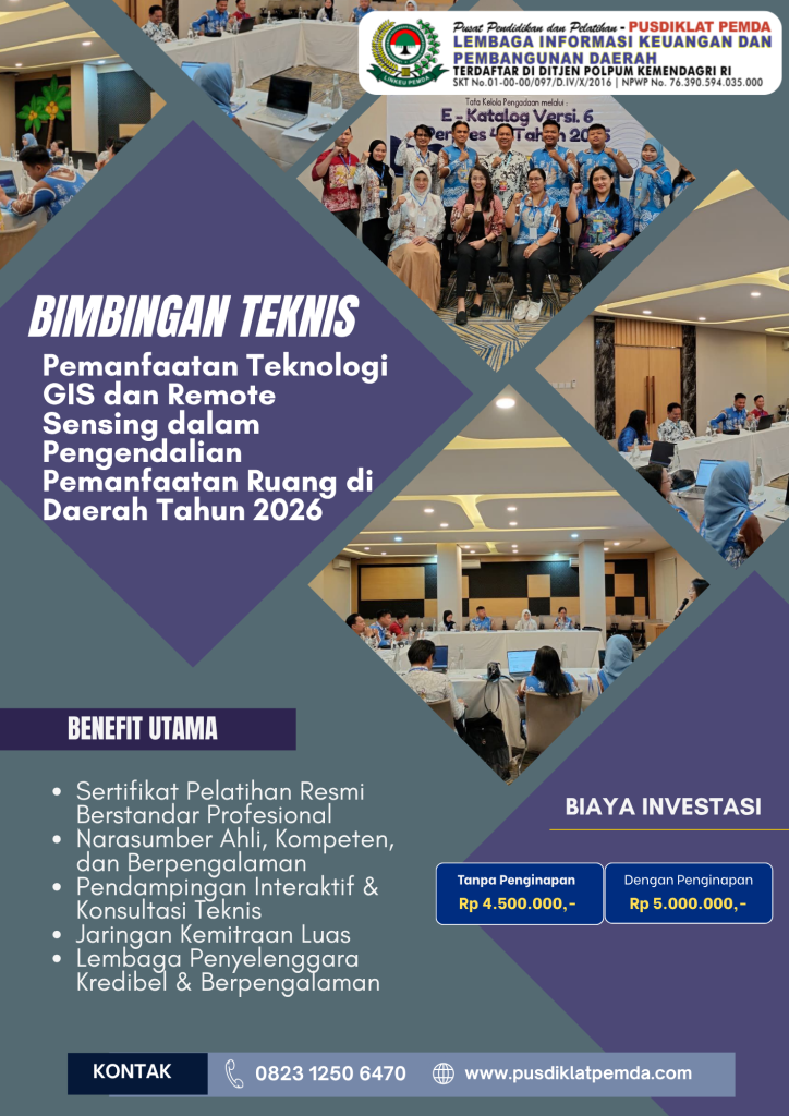 23 Apr Bimtek Pertanahan Penataan Ruang Bimtek Pemanfaatan Teknologi GIS dan Remote Sensing dalam Pengendalian Pemanfaatan Ruang di Daerah Tahun 2026 Ditulis oleh PUSDIKLAT PEMDA April 23, 2026 0 Pengendalian pemanfaatan ruang merupakan salah satu aspek penting dalam pembangunan wilayah yang ber... Lanjutkan membaca
