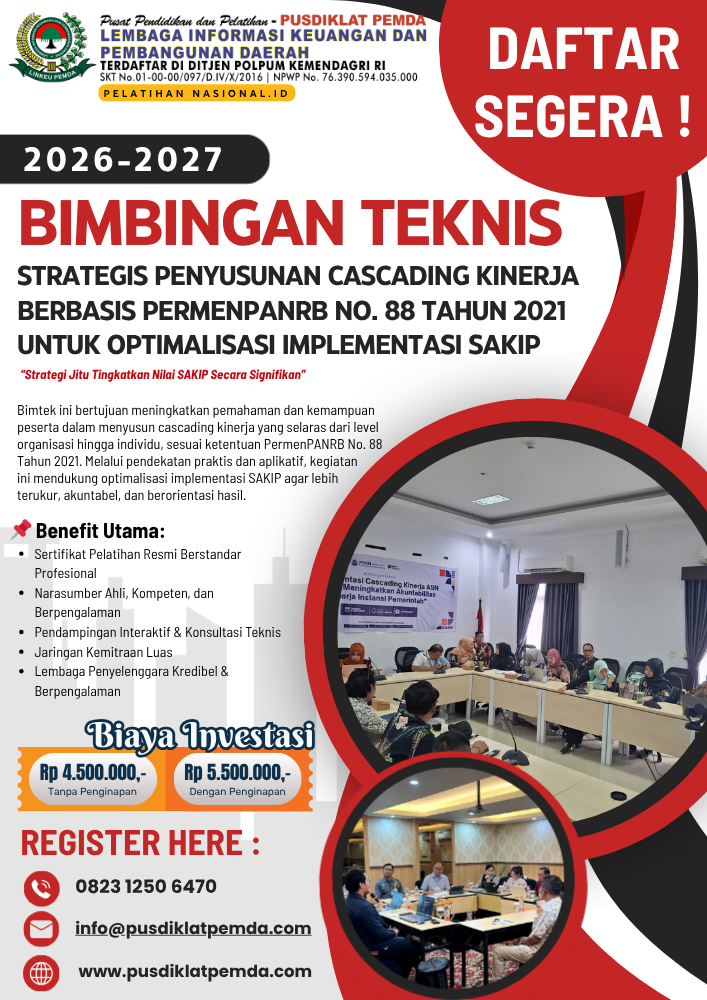 06 Feb Materi Bimtek Pemerintahan Bimtek Strategi Pemenuhan Target Kinerja ASN Berbasis Sistem e-Kinerja Terintegrasi Ditulis oleh PUSDIKLAT PEMDA Februari 6, 2026 0 Pemenuhan target kinerja Aparatur Sipil Negara (ASN) menjadi indikator utama keberhasilan reformasi ... Lanjutkan membaca